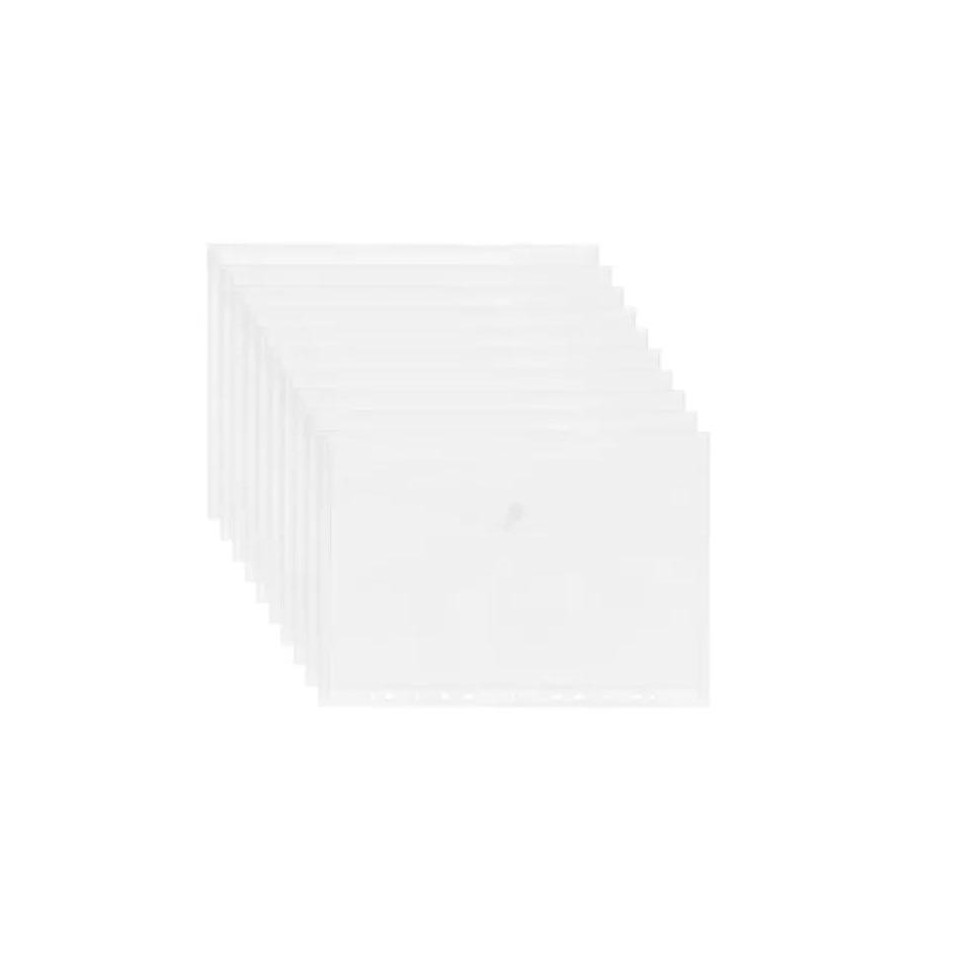 A set of white A4-sized transparent polypropylene document pockets with velcro closure and 11-hole perforation, designed to organize and protect documents in standard binders. Contains 10 pieces per pack, suitable for office, school, or home filing needs.