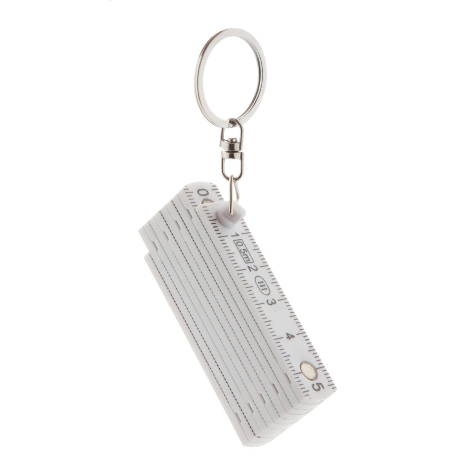Compact white plastic mini folding ruler equipped with a sturdy metal keyring, measuring up to 0.5 meters. Designed for convenient measurement tasks on the go, it easily attaches to keys, bags, or workwear for quick access in everyday situations.