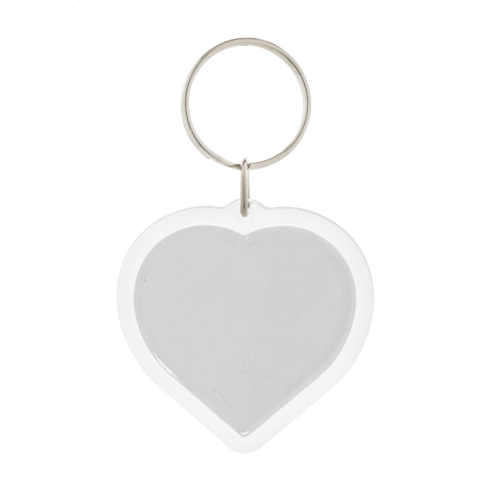 Transparent acrylic heart-shaped keyring featuring a custom full-colour paper insert and durable metal ring, ideal for everyday use as a personal or promotional accessory.