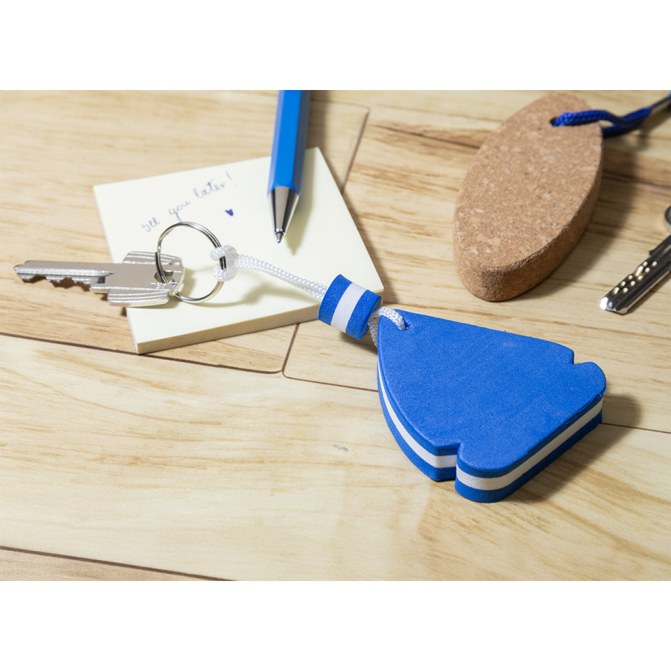 Sailing boat shaped EVA foam floating keyring with metal ring, designed for marine and outdoor activities. Keeps keys afloat in water, ideal for boaters, sailors, and watersports enthusiasts.