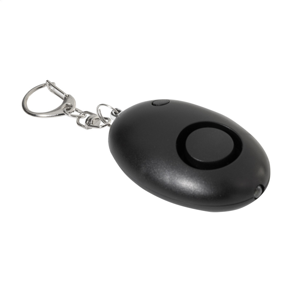 Guardian Black RABS personal alarm keyring is a compact safety device made from recycled ABS plastic. Attach it to keys or bags via metal carabiner; pull the pin to activate a loud alarm and LED flashlight for personal security during walks or travel.