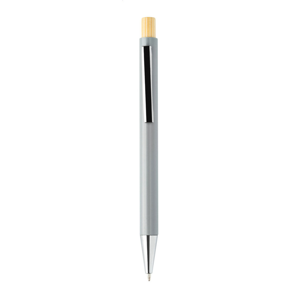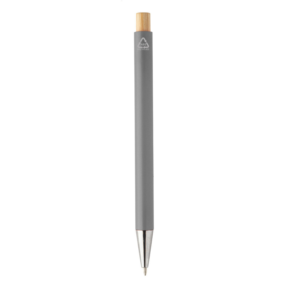 - The pen is crafted from recycled ABS plastic, with a bamboo button and a metal clip.