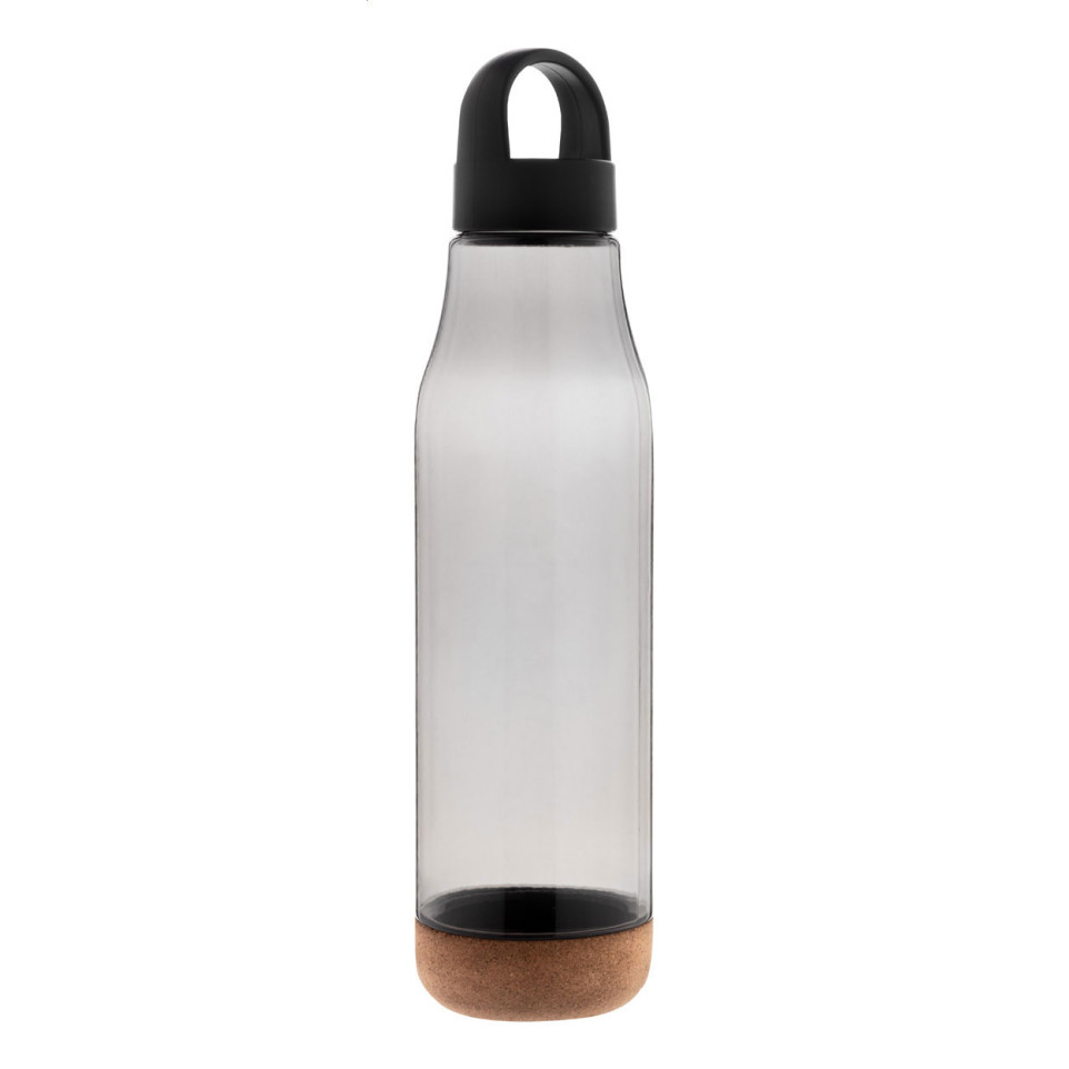 Cortex black RPET bottle is a 720 ml reusable sports bottle designed for everyday hydration during activities, featuring a natural cork base and a practical carry lid.