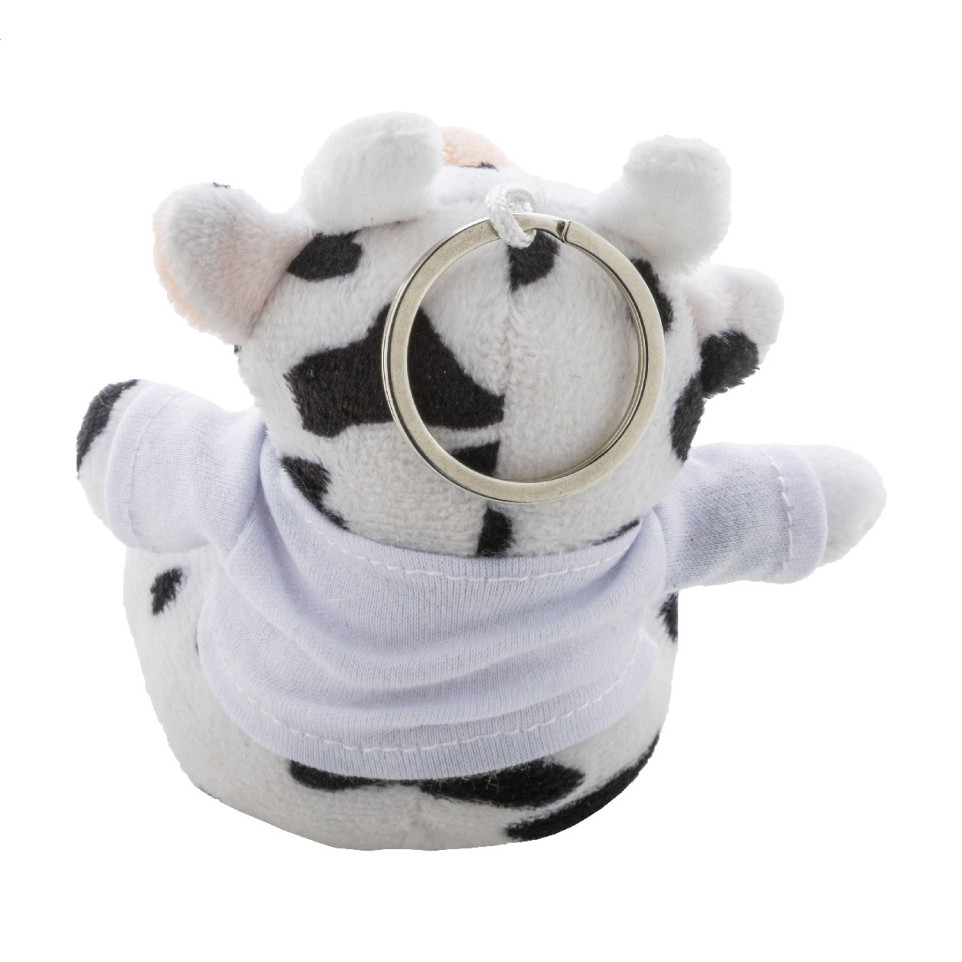 Compact white and black plush cow keyring with a soft touch and a mini T-shirt ideal for branding. Perfect as a practical accessory for bags, keys, or backpacks in daily use and professional contexts.