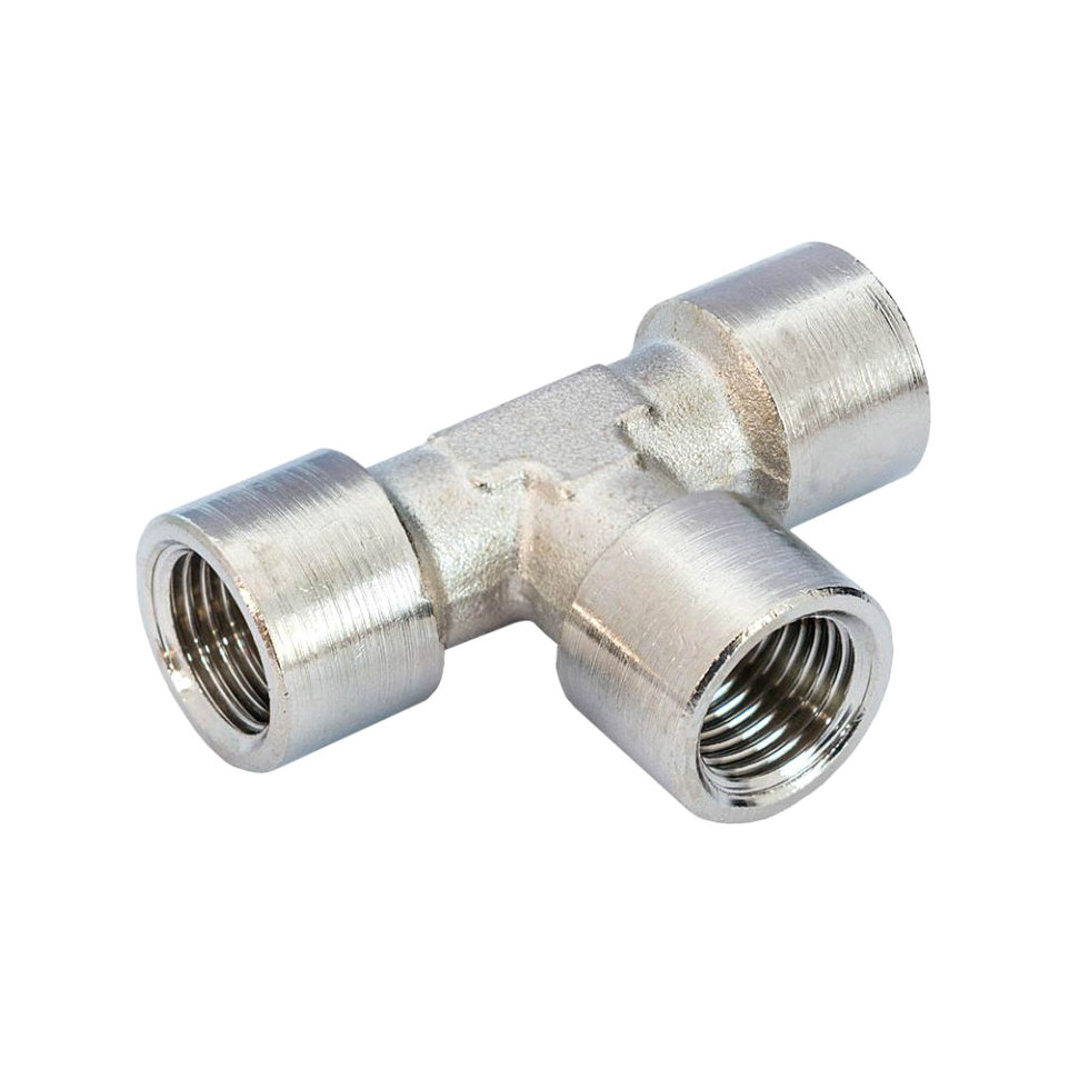 This connector is used to join three pneumatic hoses at a 90° angle, allowing air to flow in multiple directions from a single input. It is typically installed by screwing onto compatible fittings, streamlining air distribution in workstations or automated systems.