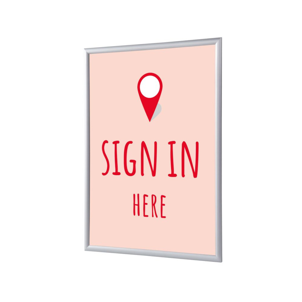 The Snap Frame A1 Complete Set Sign In Here Red English is a professional poster holder designed for A1-sized displays, featuring a bold “Sign In Here” message in English. Ideal for offices, events, educational institutions, and public spaces where clear guidance is essential.