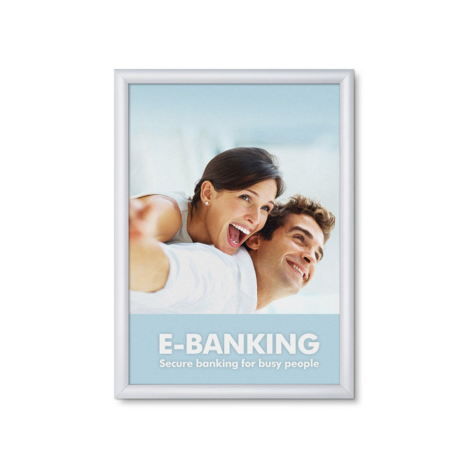 A3 snap frame with 20 mm silver anodised aluminium profile and mitred corners, designed for displaying posters indoors in retail, office, or public spaces. Ensures a secure, professional presentation and easy poster change.