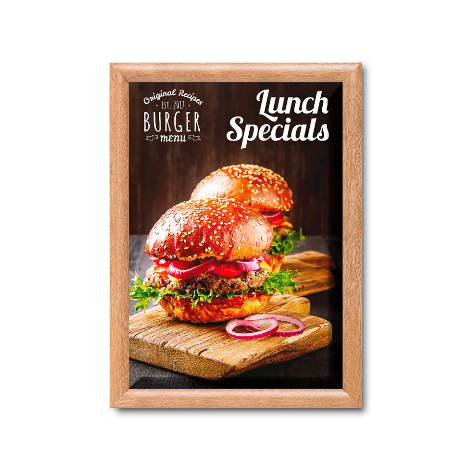 25 mm Snap Frame with mitred corners in A3 size features a wood-effect finish, designed to neatly display posters and notices in a professional setting. Suitable for offices, retail environments, educational institutions, and public spaces.