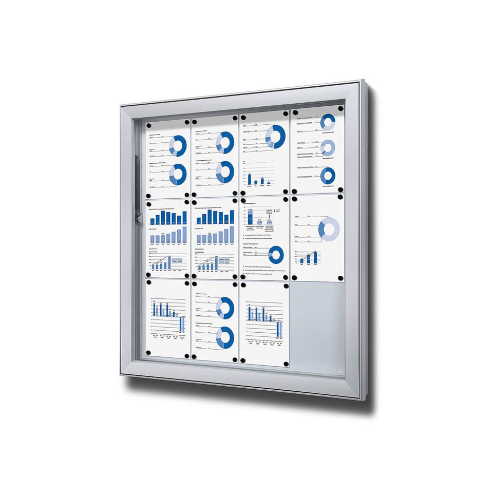 Mount the case securely on an exterior wall using appropriate fixings. Open the locked door with the supplied key, position up to twelve A4-size posters on the magnetic or pin-backed display surface, and close the case to safeguard contents from unauthorized access and the elements. Suitable for schools, offices, community centers, and public spaces.