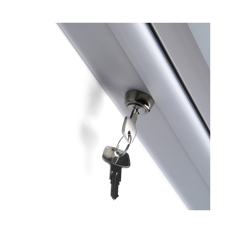 To use, open the front-hinged, lockable door with the provided keys and insert up to 27 A4 posters or notices. Secure the door to protect contents from weather and tampering. Ideal for community spaces, schools, company premises, and commercial properties requiring regularly updated public information displays.
