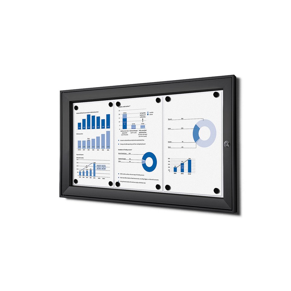 This showcase is installed on walls using screws. Open the hinged lockable door to place posters using magnets or markers on the writable backwall before locking it securely.