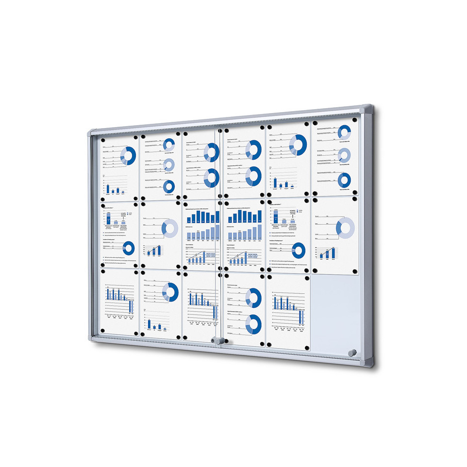 This indoor lockable showcase with sliding doors is ideal for securely displaying 18 A4-sized posters or documents in offices, schools, or public areas.