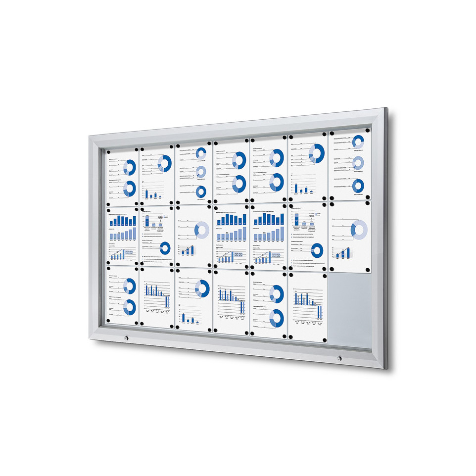 The Outdoor Lockable Showcase With Gas Spring 21x A4 is designed for secure display of posters or notices in outdoor settings, accommodating up to 21 A4 sheets. Suitable for public areas, institutions, or any place requiring weather-resistant information display.