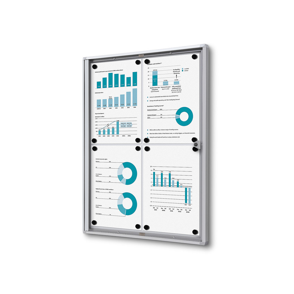 The showcase is mounted on a wall using the included hardware. Open the lockable hinged door, place your posters or documents using magnets or directly draw/write on the steel backboard with marker pens. Lock it securely when done.
