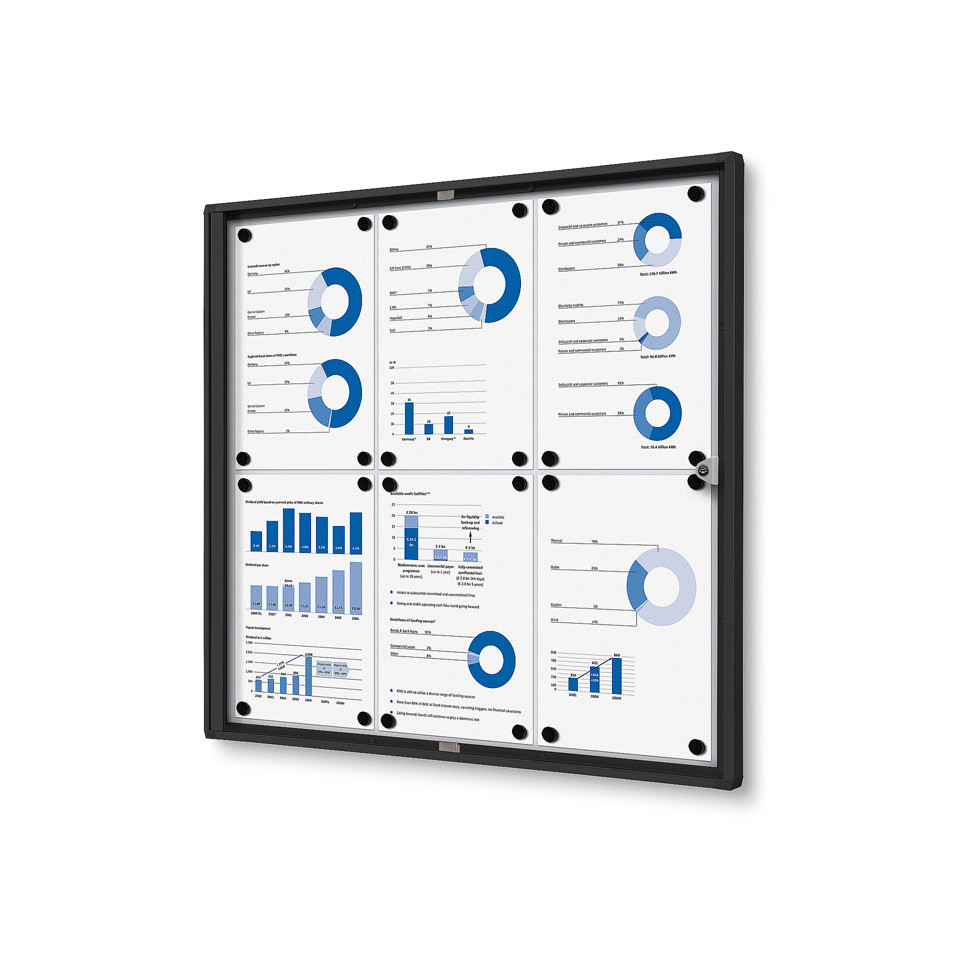 Indoor Lockable Showcase Economy Black 6x A4 is a secure poster holder designed for indoor use, allowing you to display up to six A4 documents in offices, schools, or public areas.