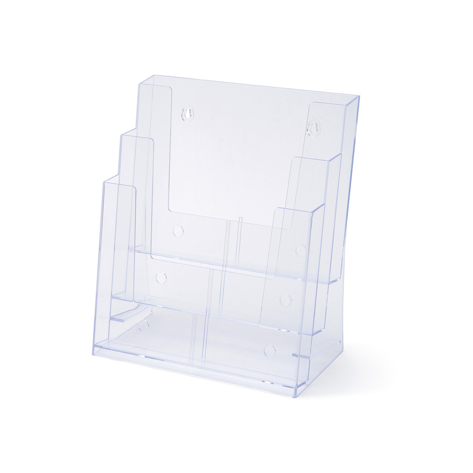 To use, simply insert A4-sized brochures or information sheets into any of the three pockets. The holder can be placed directly on a counter or fixed to a wall using standard mounting hardware, providing flexible presentation options where space management and accessibility are essential.