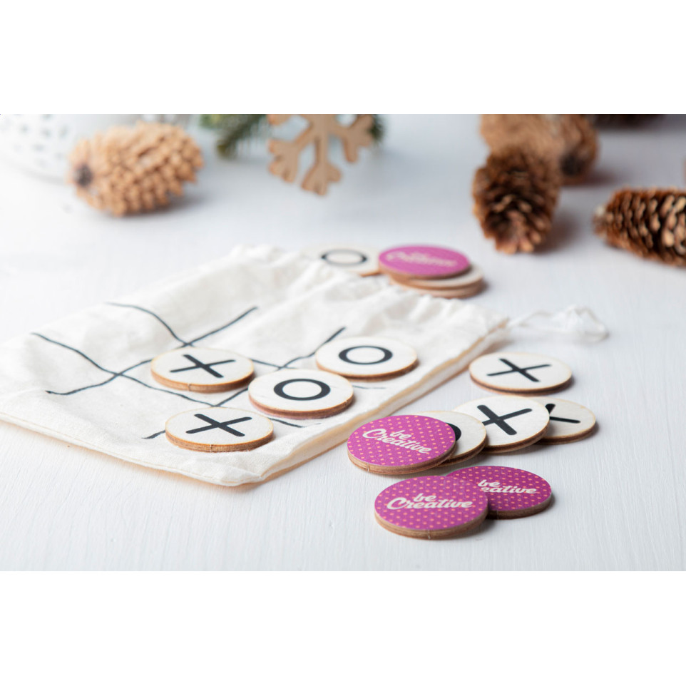 Custom-made tic-tac-toe game crafted from birch plywood, presented with 10 tokens and a cotton carry pouch. Perfect for playful challenges in the office, at home, or during events.