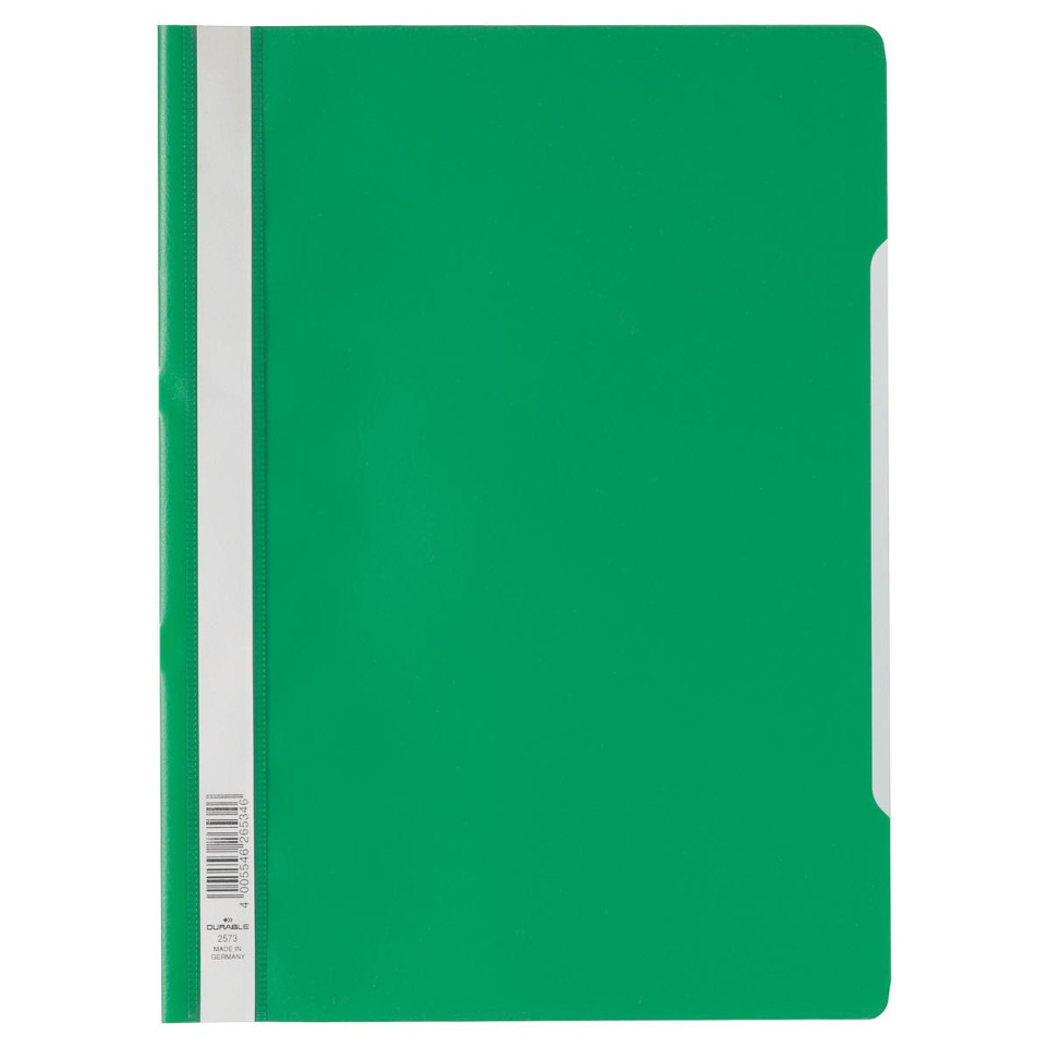 Durable A4 quotation file with a transparent cover and green back, designed for organizing, storing, and presenting documents at the office, school, or home. Suitable for integration into ring binders using sliding tabs.