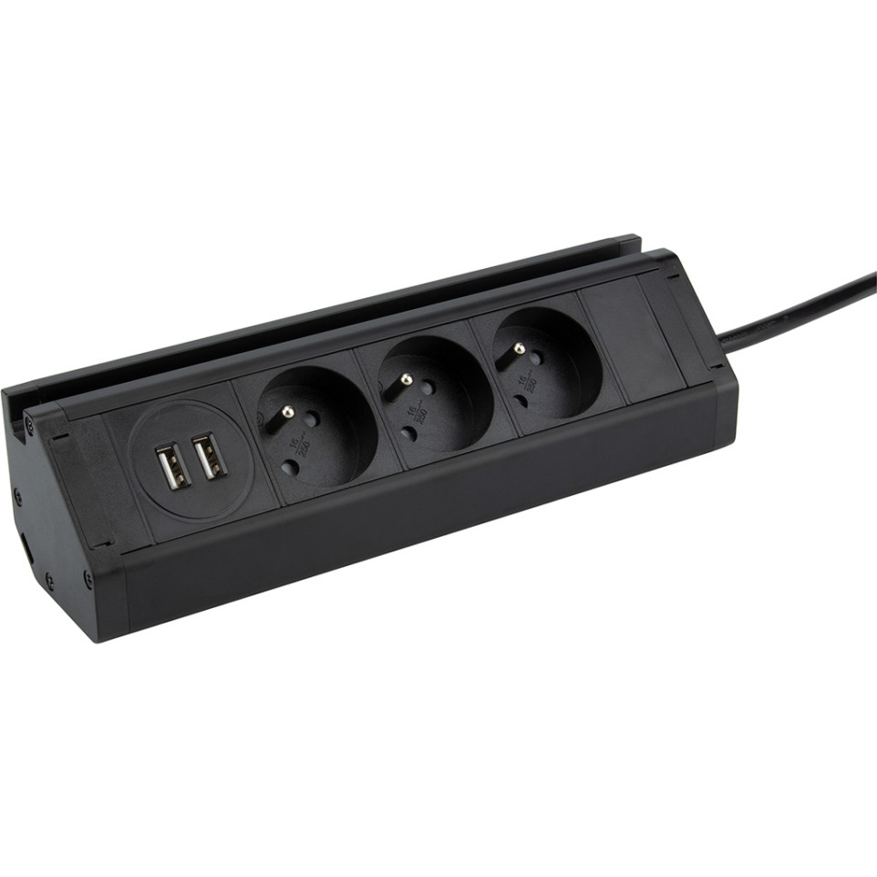 A retractable socket for worktops, ideal for offices and commercial spaces, providing a convenient and organized way to manage power outlets and USB ports.