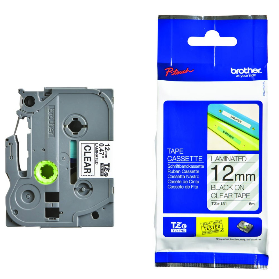 The Brother TZe ribbon for P-Touch is designed for labeling and organizing in offices, homes, or retail environments. It produces high-contrast black text on a transparent 12 mm tape, suitable for clear identification on files, equipment, and containers.