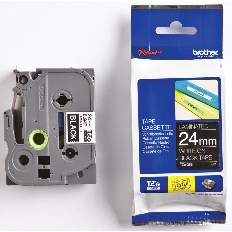 The Brother TZe ribbon for P-Touch, 24 mm white on black, is designed for producing clear, durable labels in office, industrial or home settings where strong visibility and resistance to wear are required.