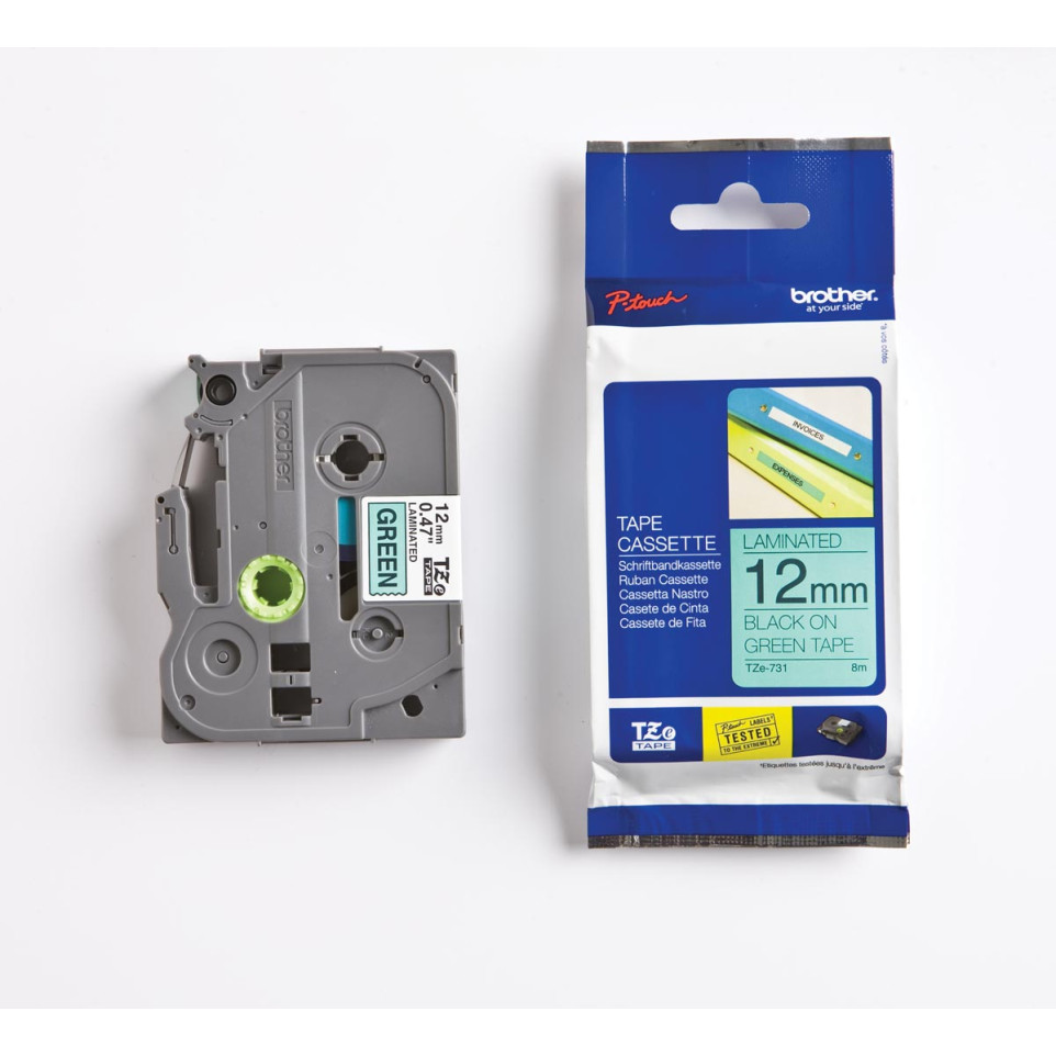 The Brother TZe ribbon for P-Touch, 12 mm black on green, is designed for clear, durable labeling of files, shelves, cables, and equipment in offices, warehouses, schools or homes using compatible Brother P-touch label printers.