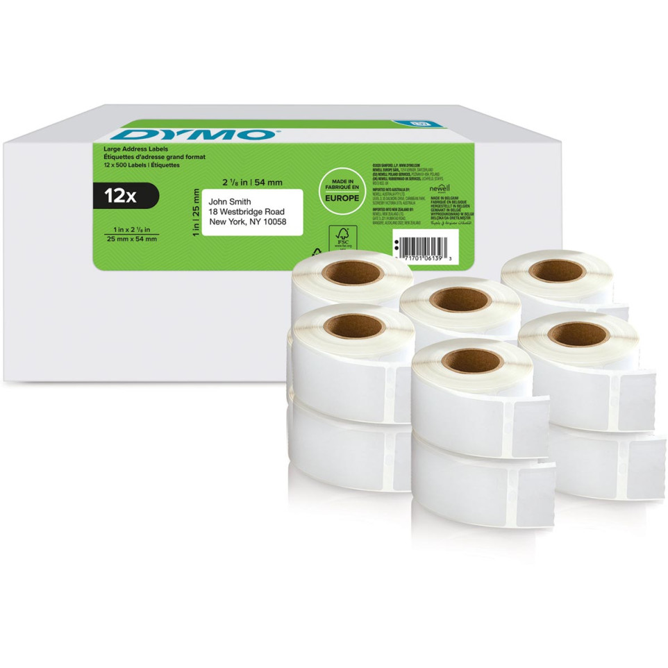 DYMO LabelWriter Labels, 25 x 54 mm, White, Box of 12 Rolls of 500 Labels Each