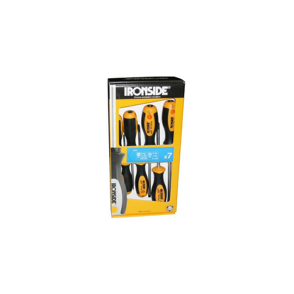 The Ironside 7-piece screwdriver set includes both Phillips (PH) and slotted (flat) screwdrivers, designed for general mechanical, electrical, and household tasks. Suitable for professionals and DIY users requiring precision and durability across various fastening applications.
