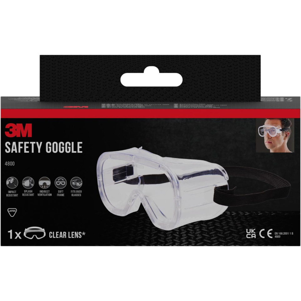 - What standard does this goggle comply with? The 3M 4800 conforms to the European standard EN 166:2001 1B and carries both CE and UKCA certification marks, confirming its tested resistance to medium-energy impacts.