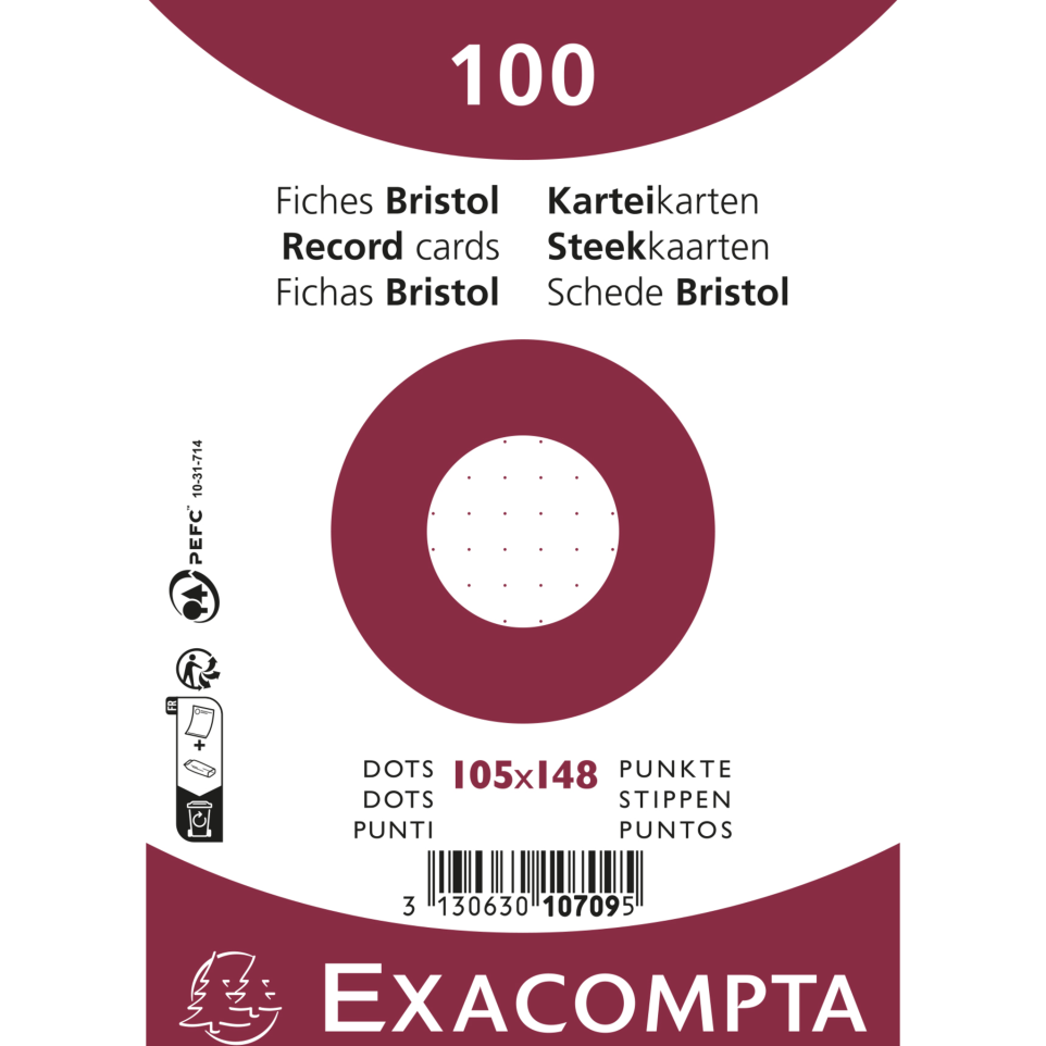 Pk100 record cards 105x148 dots white Exacompta record Cards 105x148mm, 205gsm, Dot High standard of quality and consistency. Clairefontaine paper, superior quality manufacturing, from pulp from sustainably managed forests and bleached in neutral PH, Bristol Exacompta cards are the asset of your success. Rigid and practical, these Bristol cards allow multiple use and writing comfort, they will be perfect for your practical work, note cards, messages, memos, learning cards, course summaries Dot prints or rulers are small dots that guide writing more discreetly than lines or grids, while helping to make diagrams, drawings, rounded graphics, etc. The cards can be used vertically or horizontally for a wide variety of uses in school, the office or at home. The package of 100 cards is filmed with an insert. Easy to identify thanks to its colour code 100% French manufacturing, raw materials and finished products come from the factories of the Exacompta-Clairefontaine Group. High standard of quality and consistency. Clairefontaine paper, superior quality manufacturing, from pulp from sustainably managed forests and bleached in neutral PH, Bristol Exacompta cards are the asset of your success. Rigid and practical, these Bristol cards allow multiple use and writing comfort, they will be perfect for your practical work, note cards, messages, memos, learning cards, course summaries Dot prints or rulers are small dots that guide writing more discreetly than lines or grids, while helping to make diagrams, drawings, rounded graphics, etc. The cards can be used vertically or horizontally for a wide variety of uses in school, the office or at home. The package of 100 cards is filmed with an insert. Easy to identify thanks to its colour code