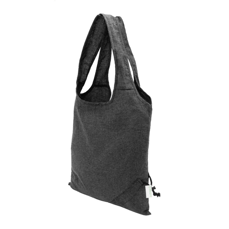 Foldable shopping bag in black, crafted from 70% recycled cotton and 30% RPET polyester, 140 g/m². Ideal for everyday shopping, thanks to its lightweight build and compact foldable design.