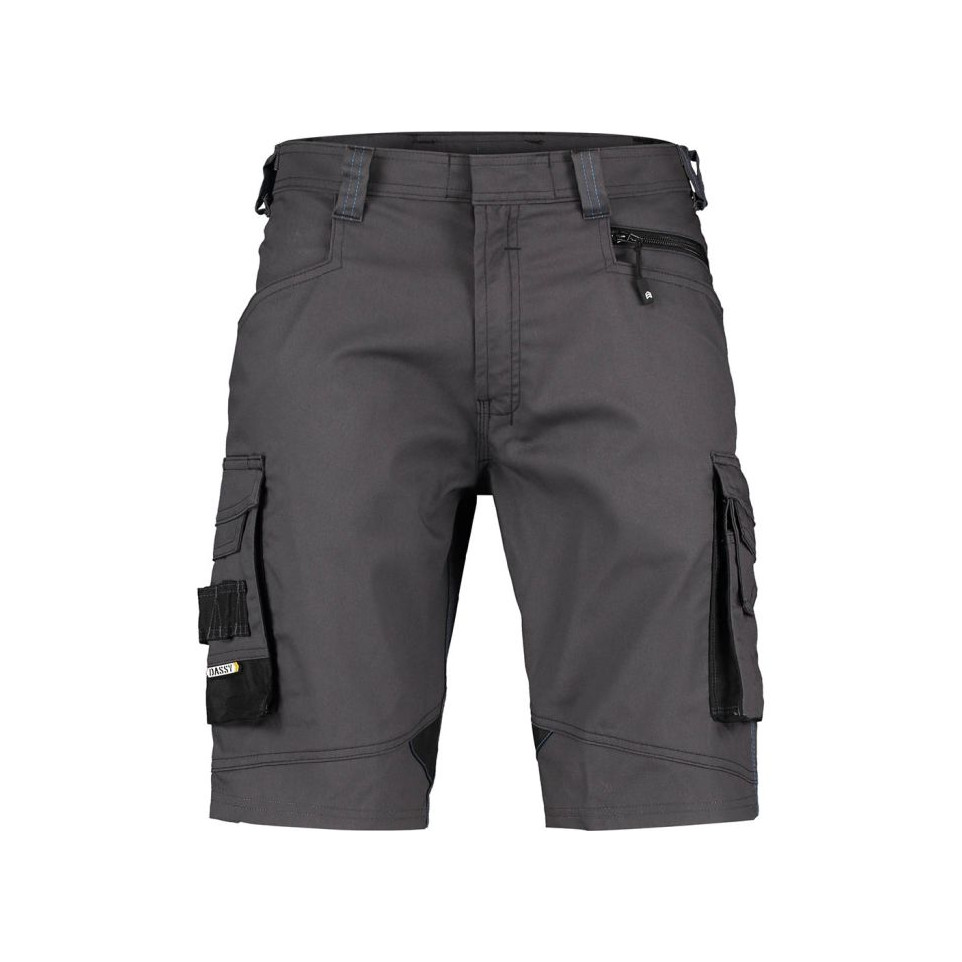 Professional work shorts designed for demanding tasks, the Dassy Short Light Flex in cosmic grey/black offers lightweight comfort, flexible movement, and reinforced durability. Ideal for tradespeople requiring practical tool storage and a tailored fit.
