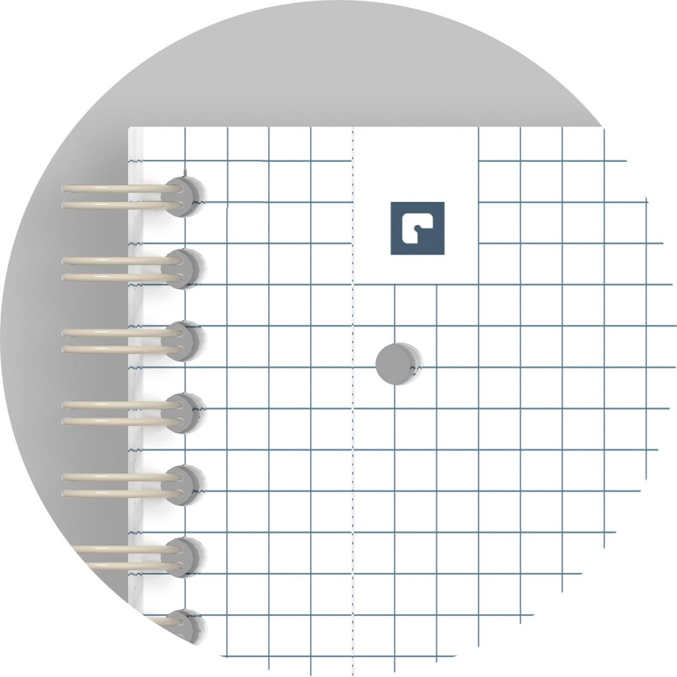 This notebook is designed to be used as a standard notebook. Simply open the cover, and you can start writing on the quadrille grid. The double spiral binding allows for easy page turning and access. The detachable pages provide flexibility in use, and the scanning function allows you to digitize your notes using the Scribzee application.