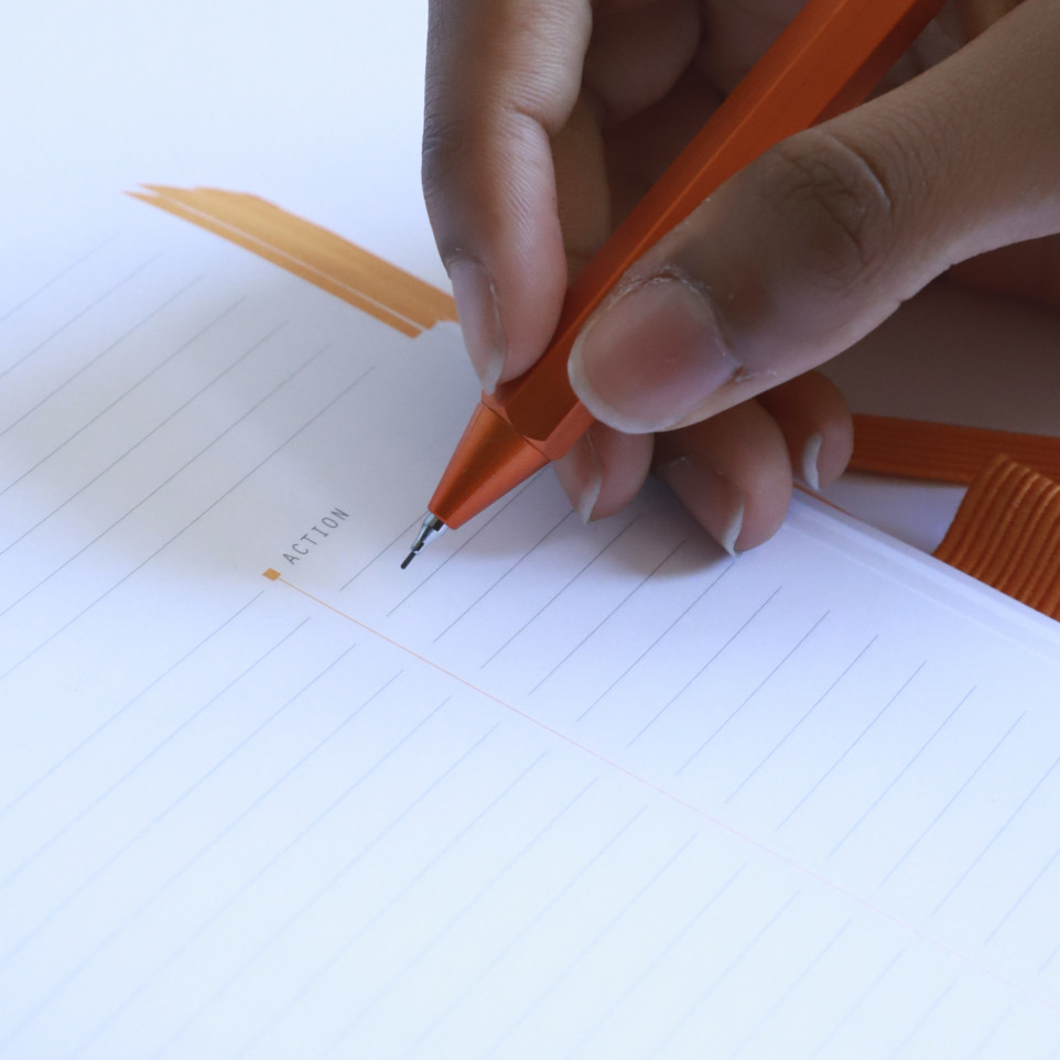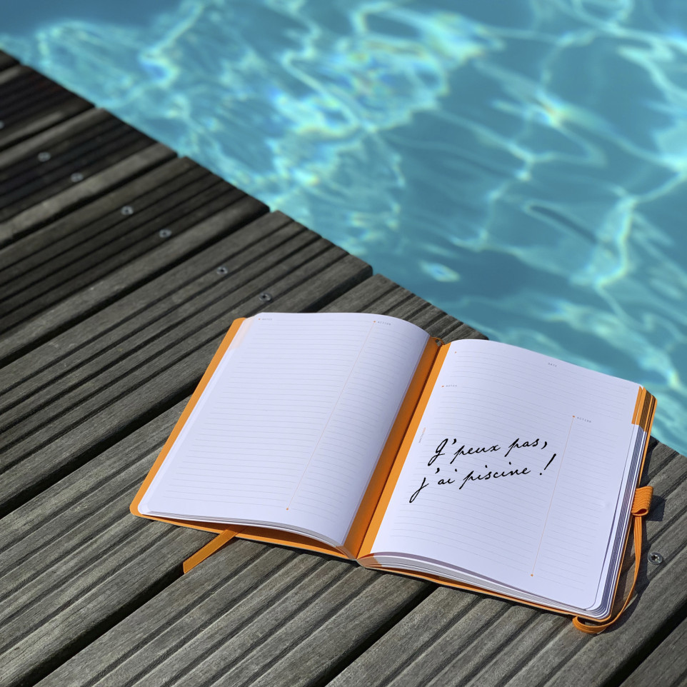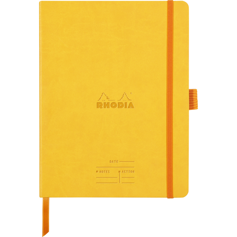 Rhodiarama Meeting A5+ 160 pages microperforé papier blanc 90g avec élastique + p-stylo Couverture souple en simili cuir italien, dos carré collé, logos embossés, fermeture élastique orange, 160 pages microperforées, papier vélin velouté blanc 90 g, calendrier perpétuel, porte-crayon, ruban marque-page, pochette à soufflets et pages de garde orange