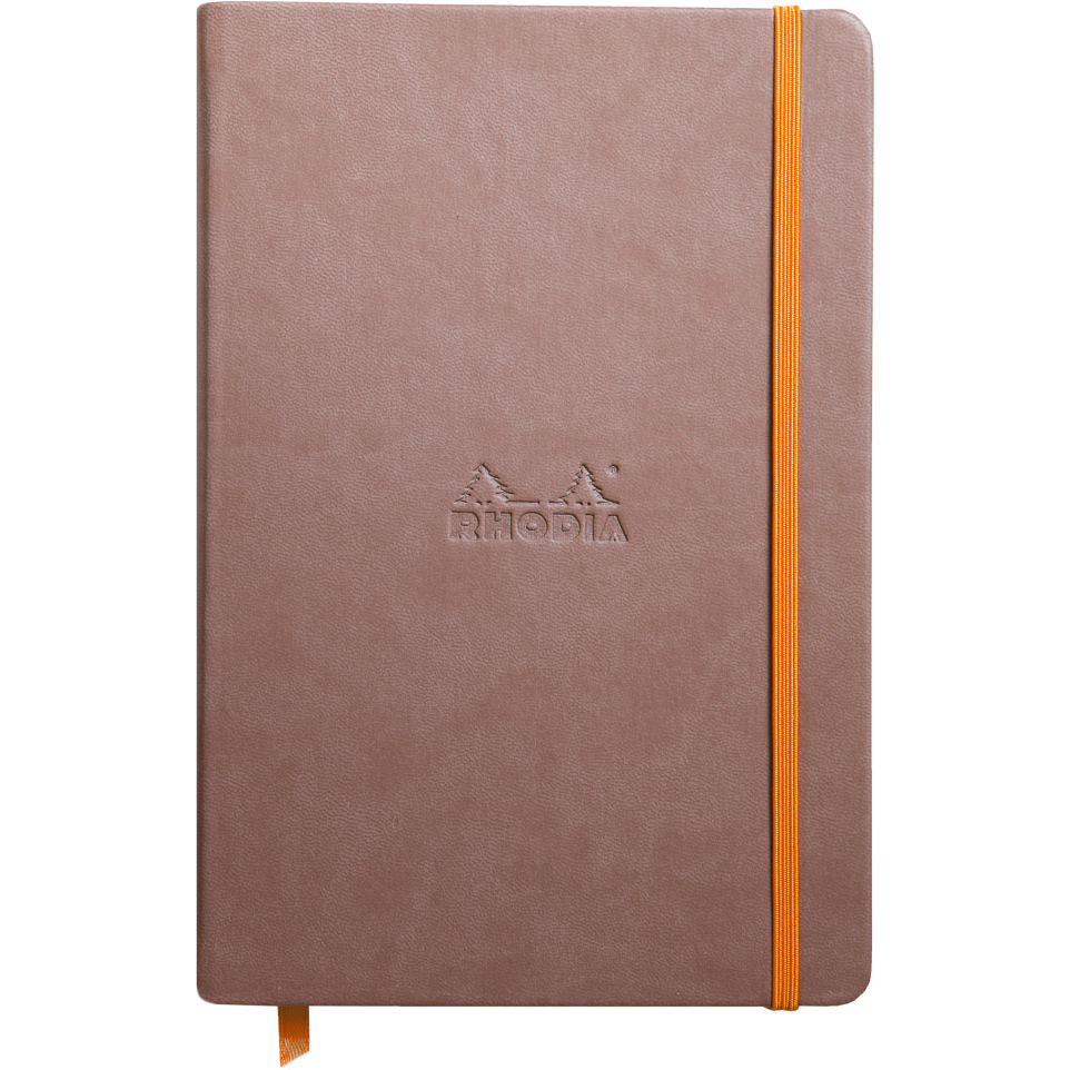 Rhodiarama carnet rembordé rigide A5 192 pages uni papier ivoire 90g fermeture élastique Comment résister au charme de la couverture veloutée et à l'authenticité de la finition cousue main des carnets rigides Rhodiarama ? Couverture en simili cuir italien, logo Rhodia embossé, fermeture élastique orange. Ruban marque-page orange, pochette à soufflet orange. Papier Clairefontaine vélin velouté 90 g ivoire à la douceur inégalée et à l'opacité et la résistance remarquables. Papier certifié PEFC.