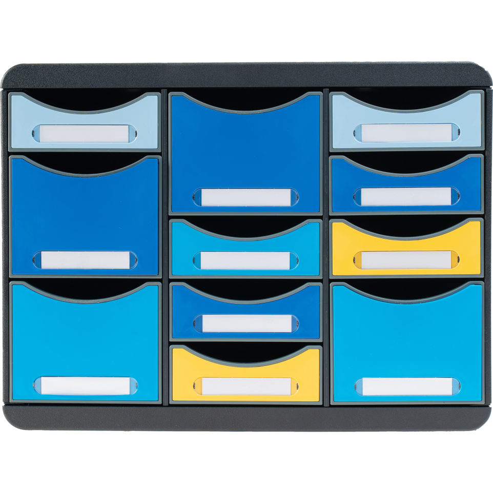 Store Box Multi Bee Blue Assorted Colors Store Box Multi Bee Blue Drawer set STORE-BOX MULTI 11 drawers Drawer set STORE-BOX MULTI 11 drawers Bee Blue Bee is a range created according to the latest trends in office design. Very decorative, perfect in the office or as interiors for the Home Office, it is intended to boost performance and enthusiasm. Without compromising on ecology, Bee Blue offers Blue Angel certified post-consumer recycled plastic products. Definitely the trendy and ecological range for environmentally aware consumers The STORE-BOX MULTI Bee Blue drawer set is versatile, with its 11 drawers, it can store and organise all your office essentials. Its 7 small drawers accommodate your sticky notes, cards, pens, paper clips, coffee capsules, and its 4 tall drawers enable storage of larger objects such as scissors, tape, chargers, staplers, ink pads It is suitable for office, home office or school use. The organisation of the drawers of the STORE-BOX is 100% modular and adaptable according to your needs. The box is designed in a single block making it more resistant, ultra-rigid and durable It is stackable using the 4 notches which ensure the stability of the boxes. Smooth drawer action with safety stop. Supplied with label holders for easy identification of the contents.
