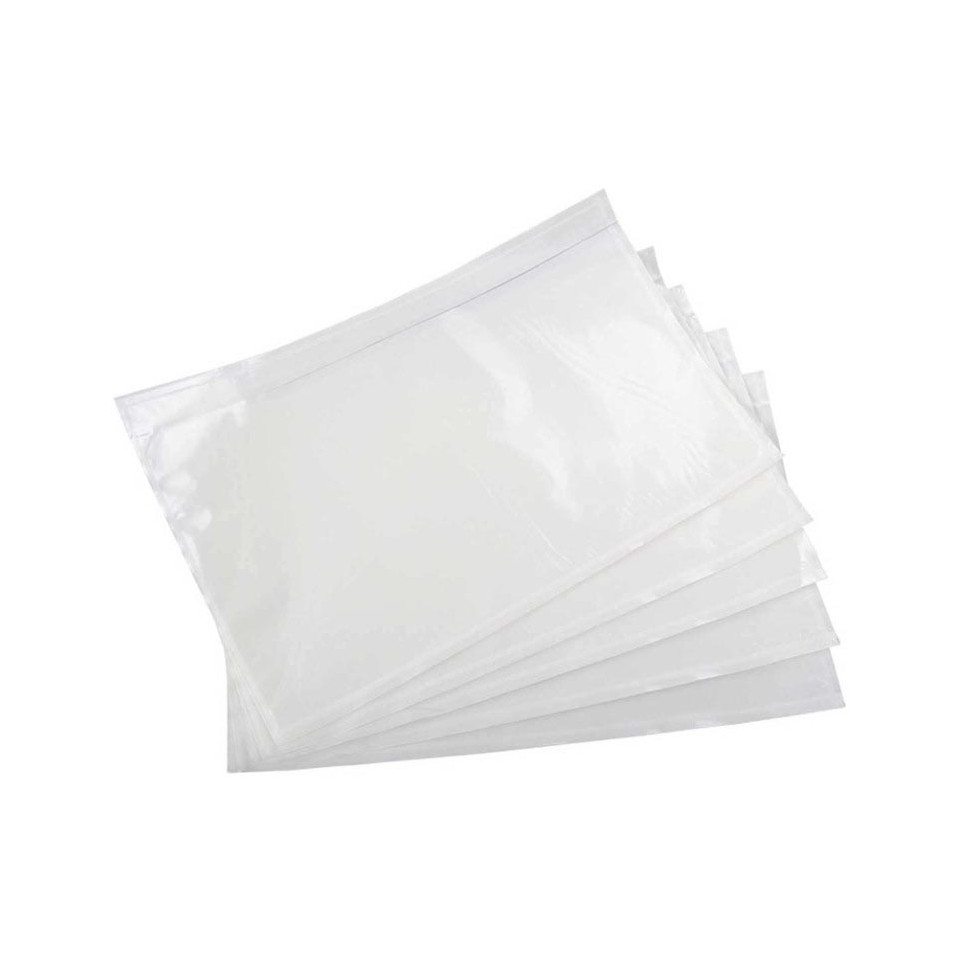 The C4 document pouch (328 x 235 mm) is a transparent, self-adhesive polypropylene sleeve designed for attaching shipping documents directly to parcels or freight during transport or sorting.