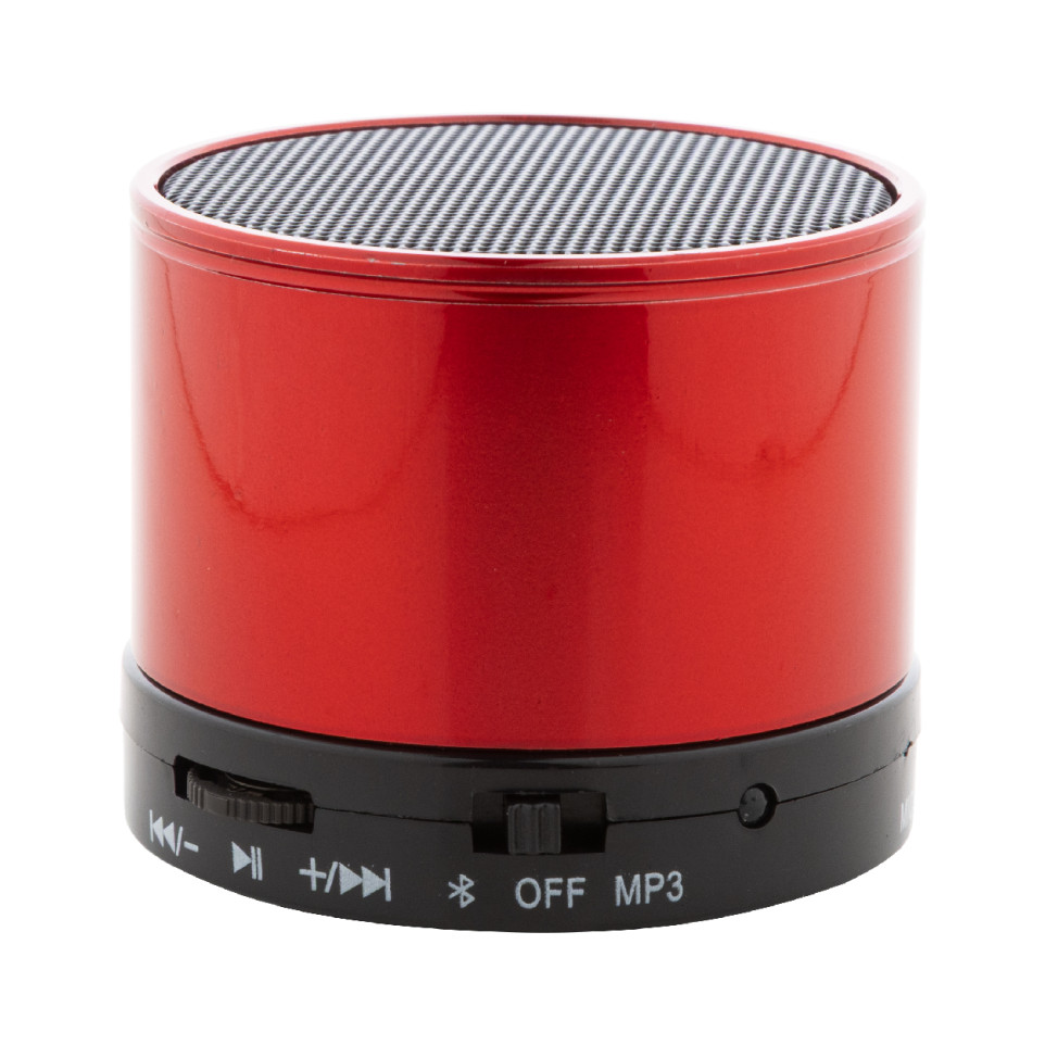 Compact and sleek Decibel red bluetooth speaker with metal housing, offering versatile audio playback options including radio and MP3 player functions. Perfect for on-the-go music enjoyment or hands-free calling in any setting.