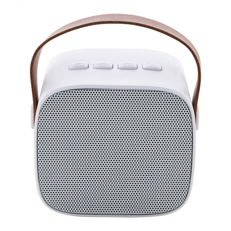 The Rabeat white RABS Bluetooth speaker delivers dynamic stereo sound in an eco-friendly design. Featuring Bluetooth 5.0 technology and a convenient PU leather carry strap, it's perfect for on-the-go listening experiences.