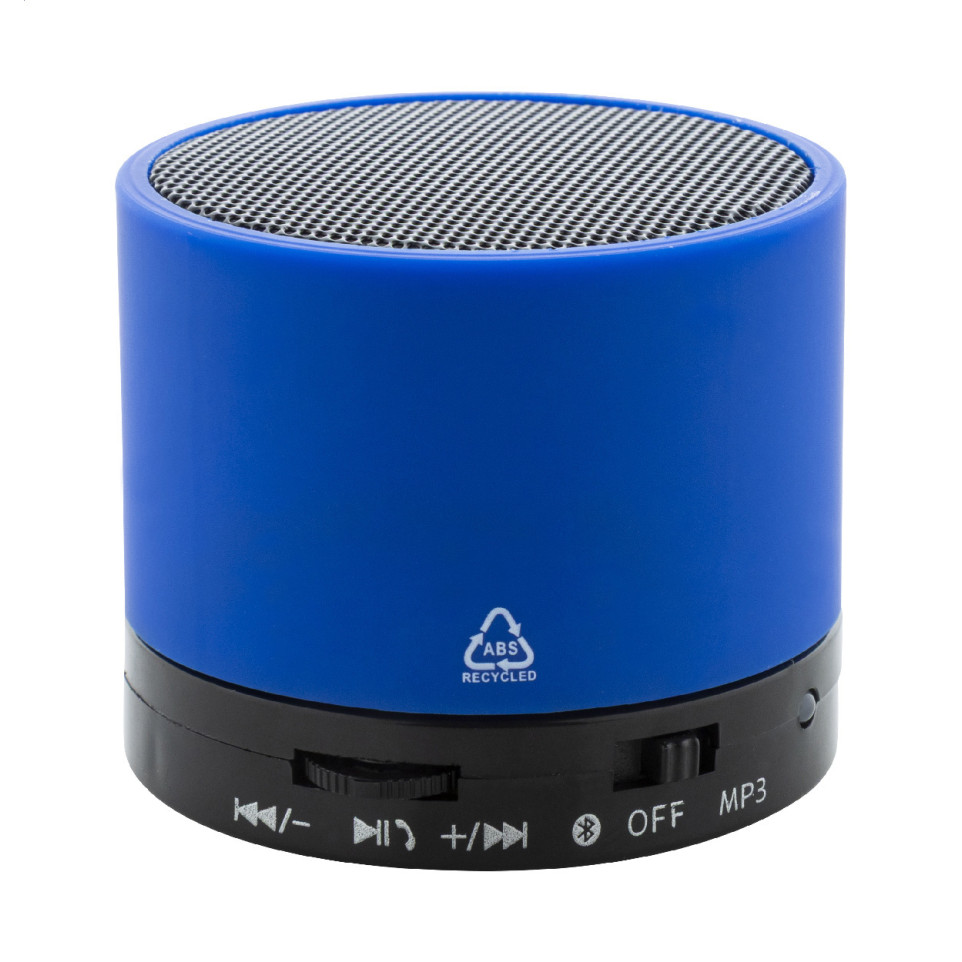 Compact blue wireless speaker crafted from recycled ABS in a rubberized finish with metal mesh, featuring a rechargeable 300 mAh battery for portable music playback, conference calls, and micro SD MP3 enjoyment in any setting.