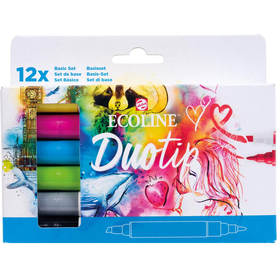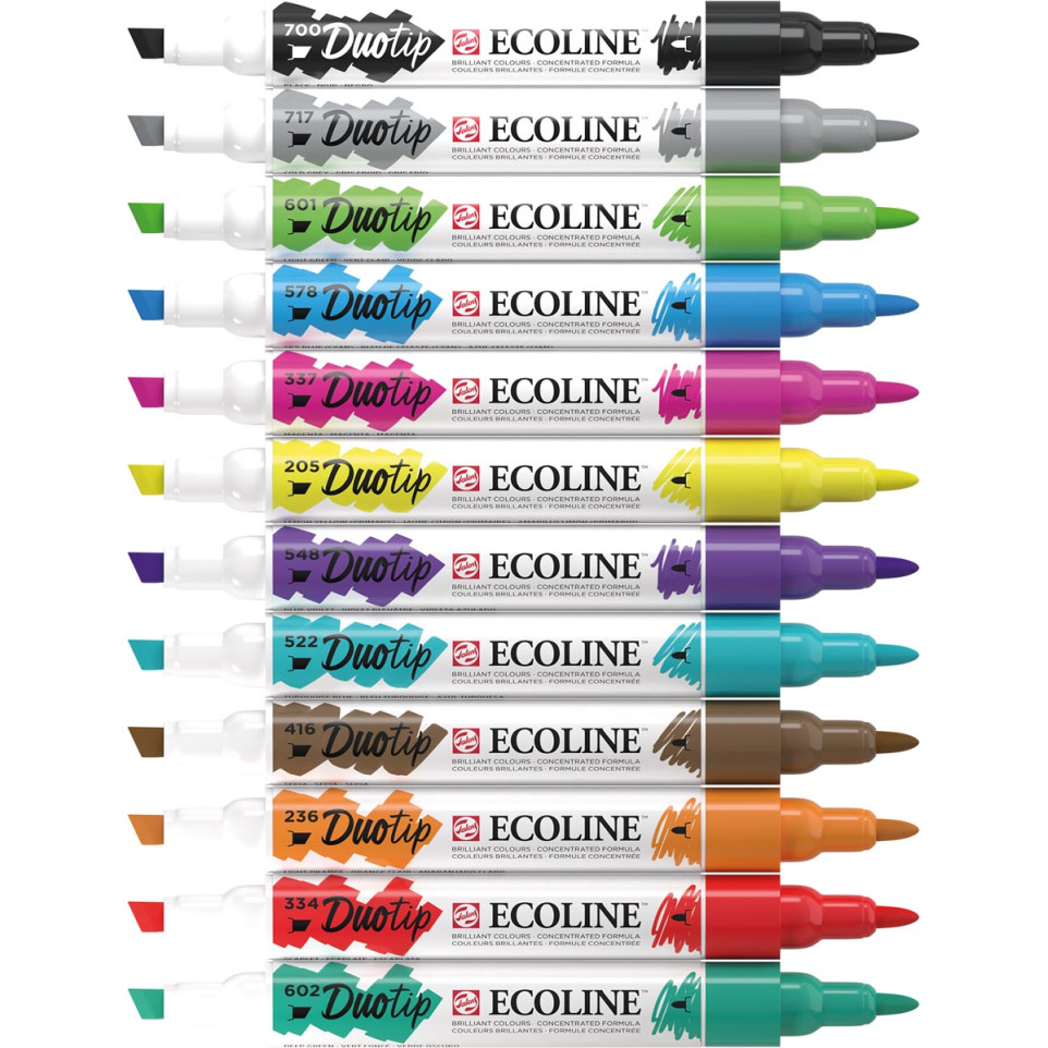 The Talens Ecoline Duotip Brush pen is used for creating fine and broad lines, shading large areas, and blending colors to achieve beautiful watercolor effects and seamless transitions. It is ideal for sketches, graphics, illustrations, hand-lettering, calligraphy, and mixed media.