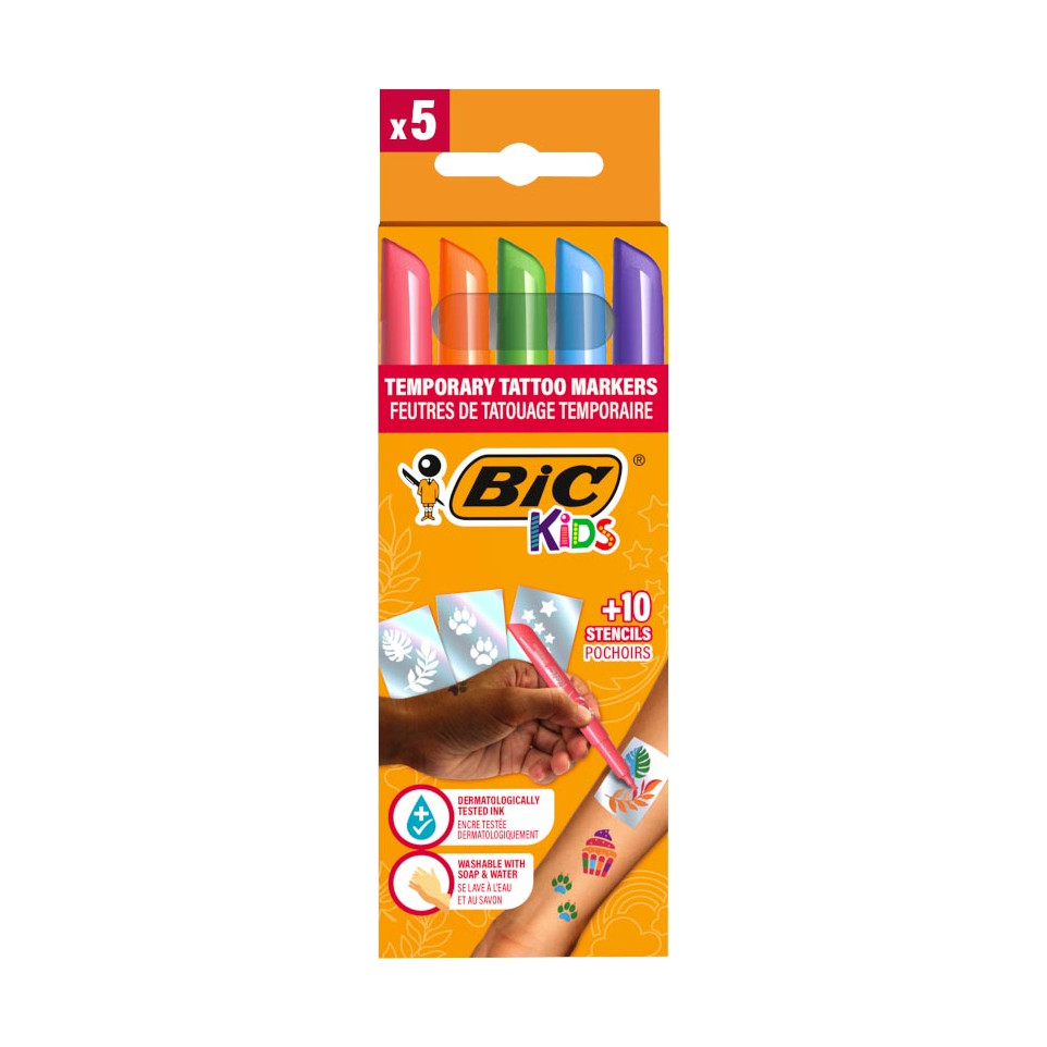 Simply apply the markers to the stencils, place on skin, and gently rub to create temporary tattoos. Clean up with soap and water.