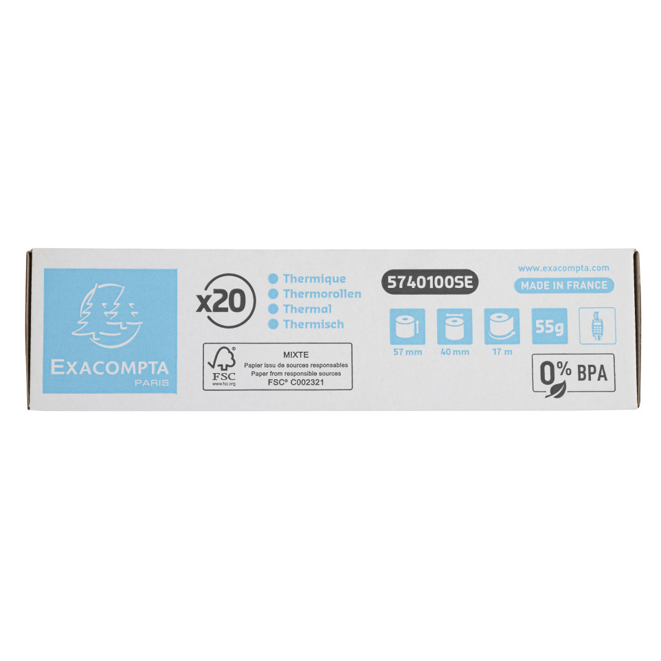 Exacompta Ref: 5740100SE - 57 x 40mm, 55gsm Thermal Paper Receipt Till Rolls, For PDQ Credit Card Machines, Card Readers, EPOS, POS Terminal, BPA Free, 17m, White, Box of 20 Premium 55gsm thermal paper rolls for clear and concise printing every time, The printed receipt stays legible and will not fade over time giving you and your customers peace of mind, Keep your card machine performing at its best. 57mm width and 40mm diameter card machine rolls for use with all brands of credit card machines including Epson, Bixolon, Spire, Zebra, Ingenico, Verifone and Pax, Each till roll is 17m in length (+ or - 2m) for less roll changes. BPA free and made in France from FSC-certified (FSC-C002321) paper, By choosing these card machine paper rolls you are supporting responsible management of the world's forests. Receipt rolls can be quickly and easily replaced to save time and ensure precise printing, End of roll warning so the machine is always ready to use, Comes supplied in a dispenser box ensuring the rolls are easy to access when needed. Box of 20 rolls ideal for businesses such as shops, cafes, restaurants and kiosks, The resealable cardboard box protects the rolls from light and humidity to keep them in perfect condition when in storage.