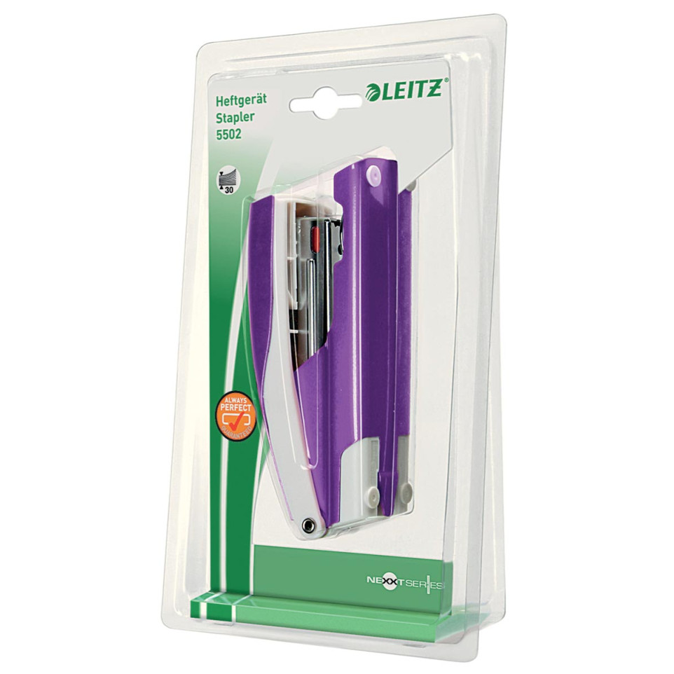 The Leitz NeXXt WOW 5502 stapler is a robust metal desktop stapler with a vivid purple metallic finish, designed for daily office or school use. Suitable for medium to heavy-duty stapling tasks, it combines durability with style.