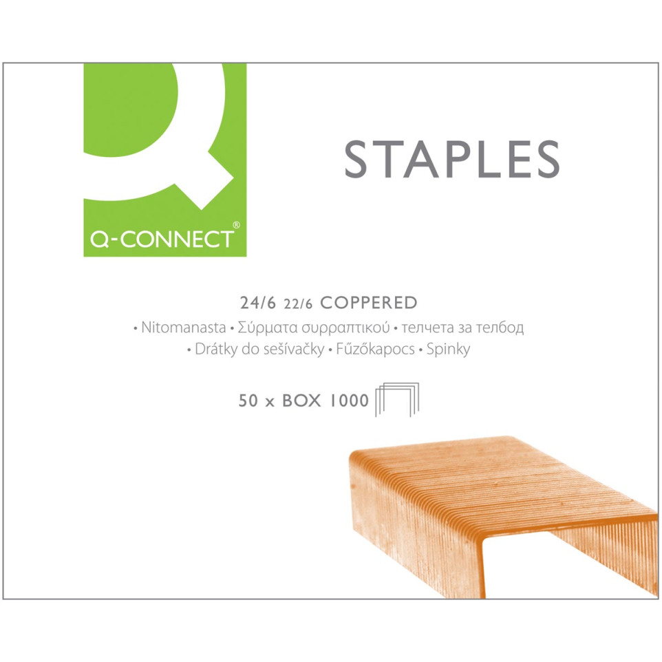 Q-CONNECT 24/6 copper-plated staples are designed for use with standard office staplers, providing reliable and precise binding for everyday paperwork. Each box contains 1,000 staples, suitable for general business and administrative tasks.