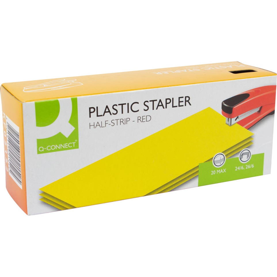 Compact and practical, the Q-CONNECT half strip stapler securely binds up to 20 sheets of paper with ease. Its vibrant red plastic body makes it ideal for both office and home environments demanding everyday reliability.