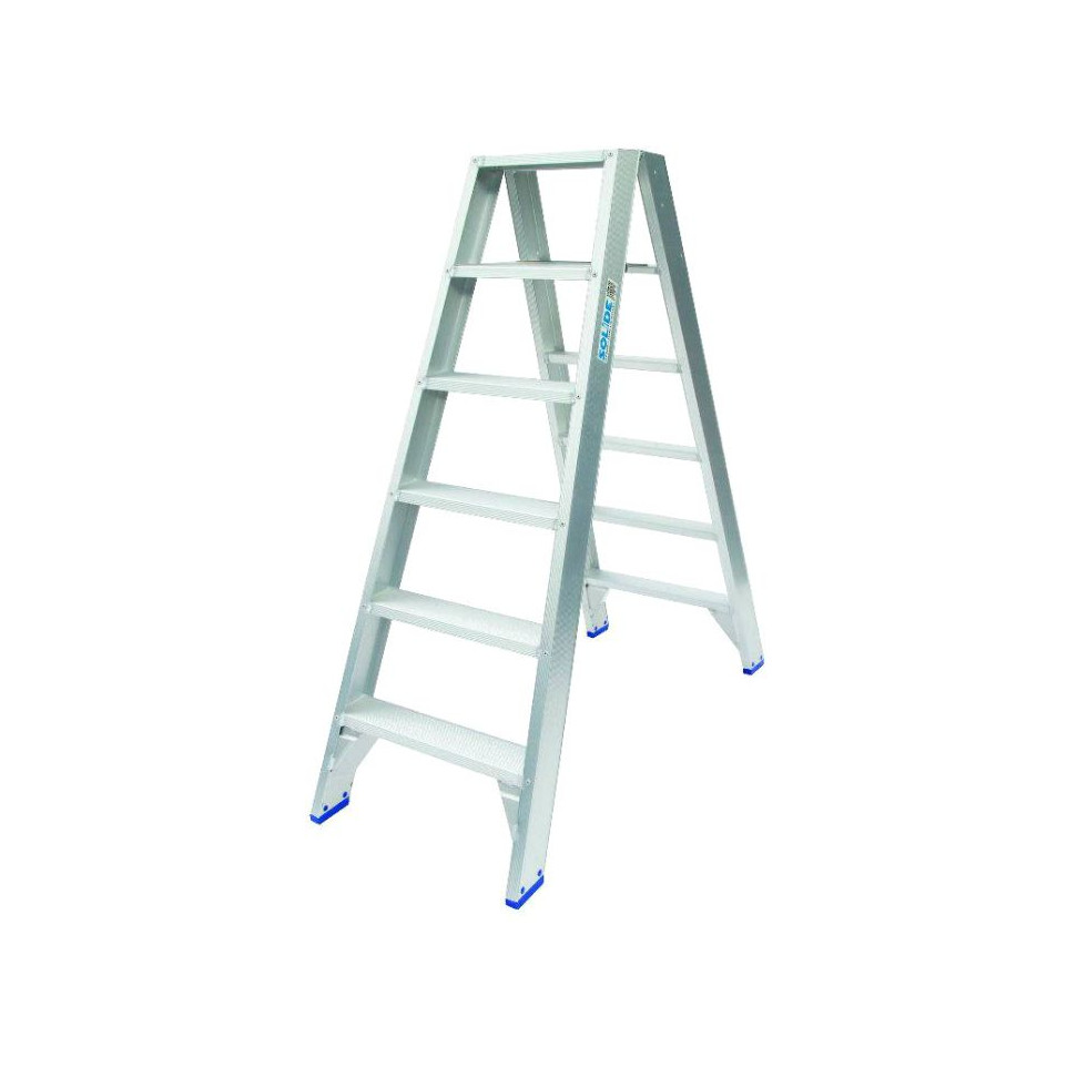 This Escabelle double à charnière 2 x 6 marches / pce is designed for heavy-duty use in various settings, including construction, maintenance, and industrial applications.