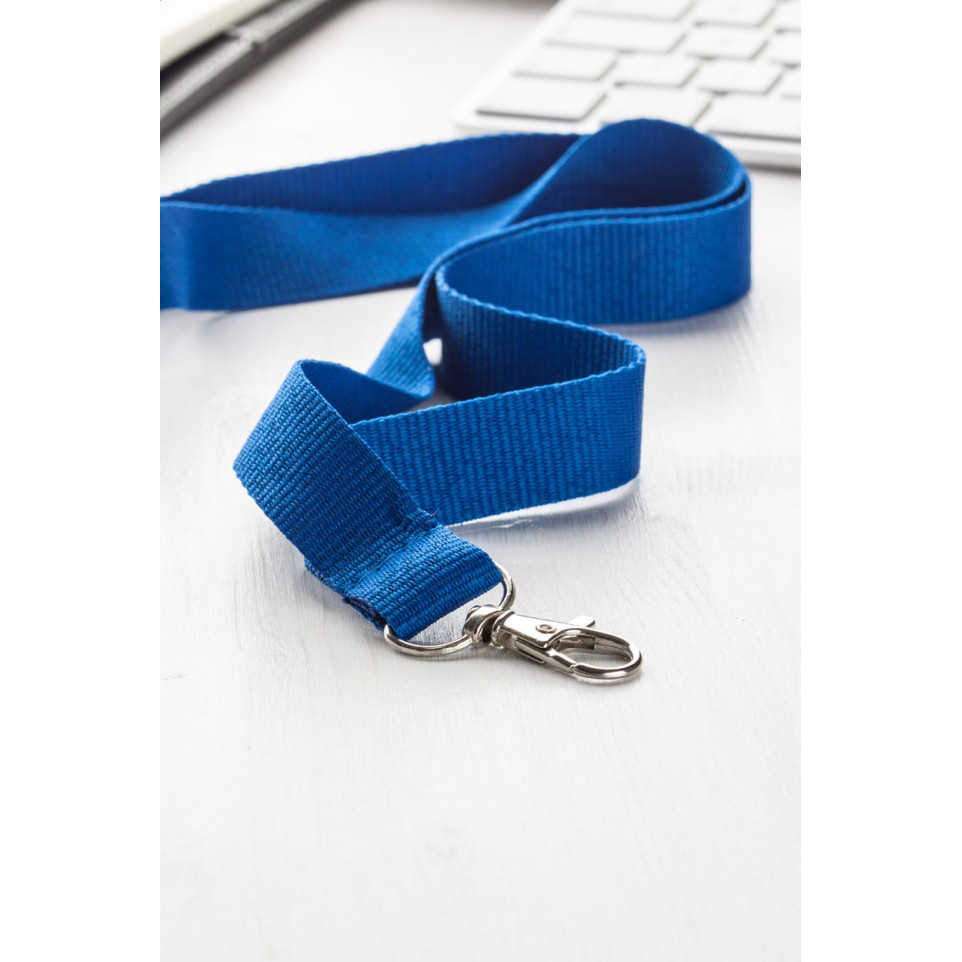 Event blue lanyard with a robust metal carabiner, crafted from durable polyester. Its lightweight design and 2 x 50 cm dimensions make it ideal for identification badge display or carrying small accessories at events, conferences, and workspaces.