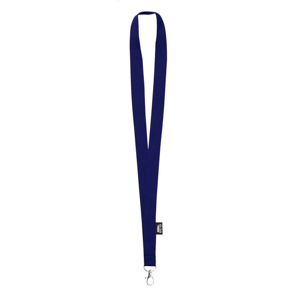 Larpet dark blue lanyard is a practical and sustainable neck accessory made from RPET polyester and equipped with a sturdy metal carabiner, ideal for securely carrying badges, keys, or identification at events and in daily use.