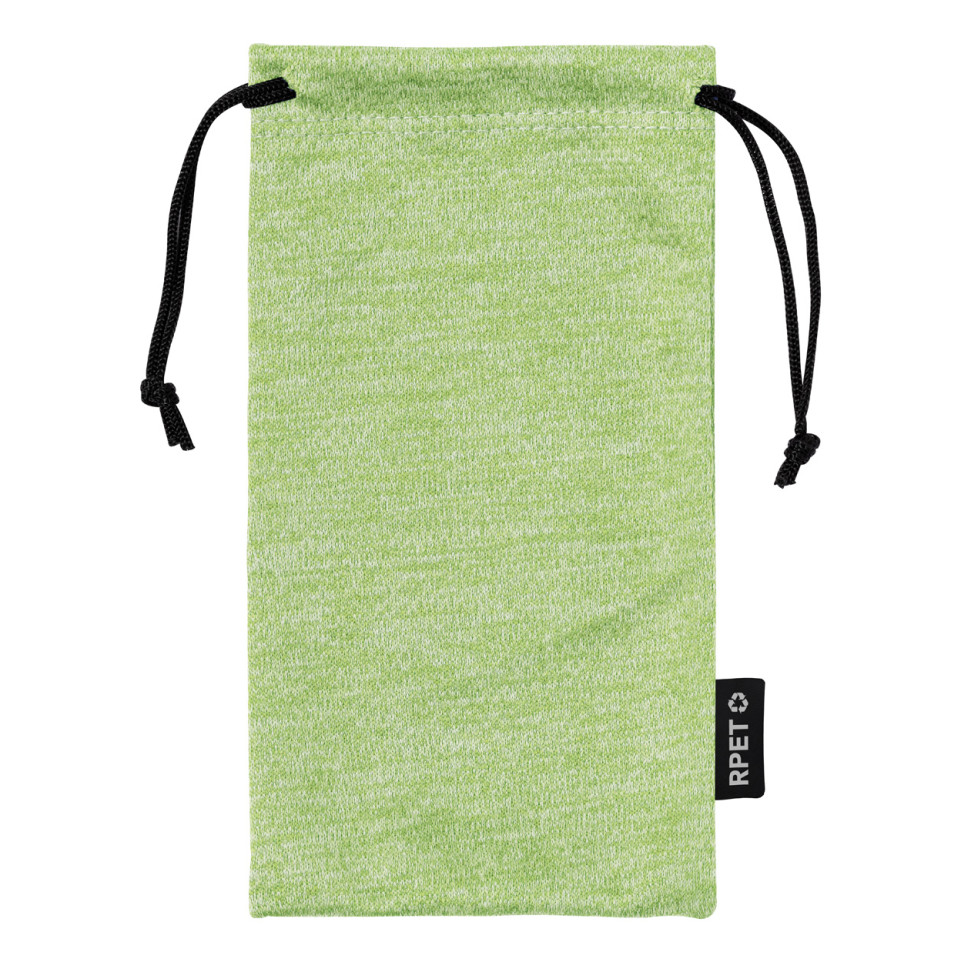 Drawstring sunglasses case crafted from RPET microfibre in an elegant green color. Perfect for protecting eyewear from scratches and dust while showcasing environmental commitment.